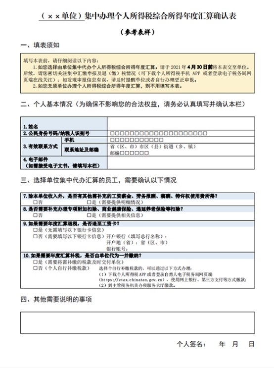 1.如需单位代办年度汇算的,您需在2021年4月30日前与单位以书面或者电子等方式进行确认(选择自行申报的无需与单位确认);2.确认事项包括(参考表样如下):(1)是否有需补充的收入、扣除等信息并需补充完整;(2)如您可以申请退税,需确认是否申请退税并提供退税银行卡账号;如您需补税,需确认税款支付方式;3.单位根据您提供信息代您填写申报表、计算应退(补)税并办理申报;4.如果需要补税,由单位代缴税款的,需将税款交到单位由其代缴;自行缴纳税款的,可以在单位代为申报后自行通过手机个人所得税APP、自然人电子税务局网页端(https://etax.chinatax.gov.cn)或到办税服务厅缴纳。