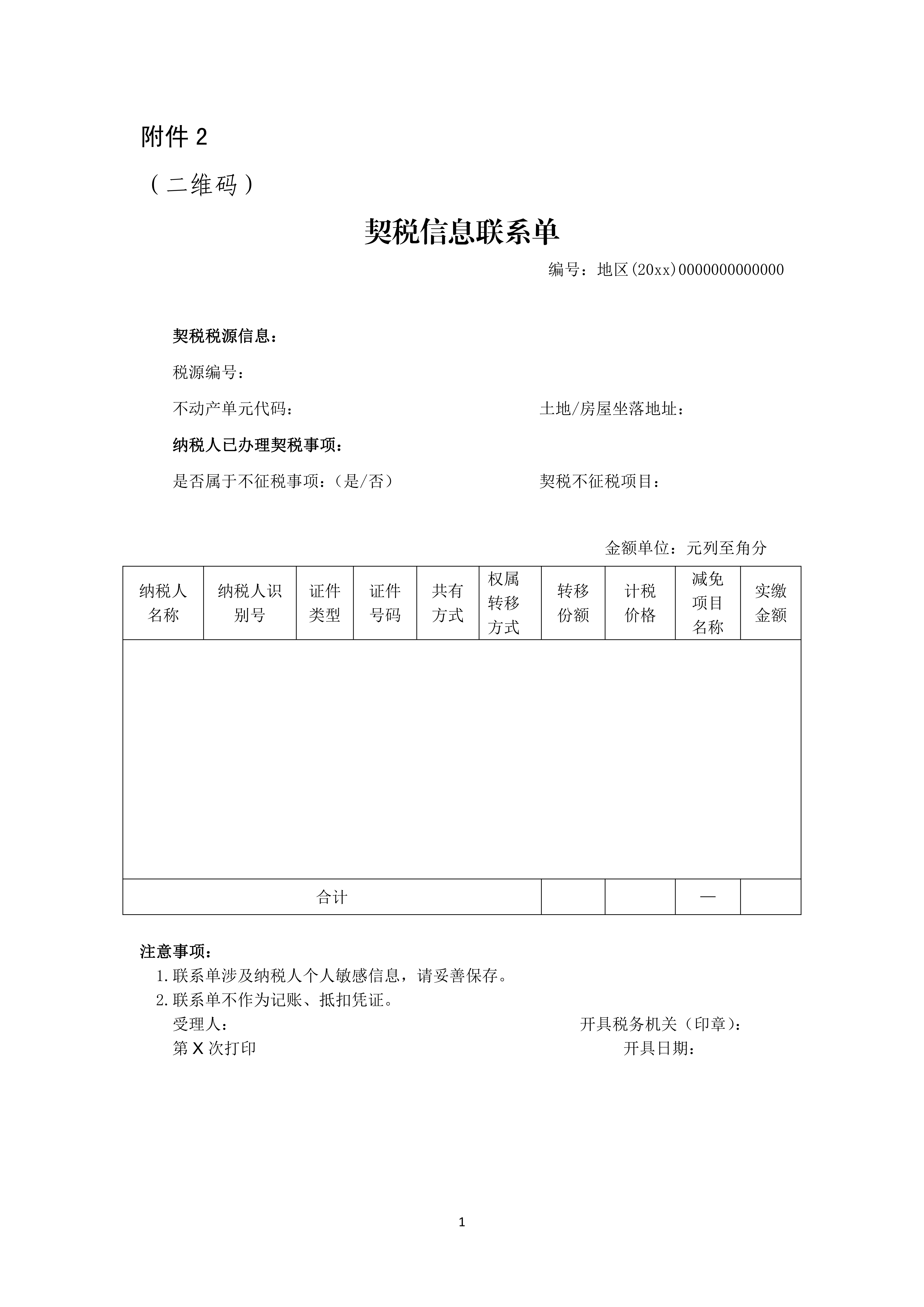 六、税务机关在契税足额征收或办理免税(不征税)手续后,应通过契税的完税凭证或契税信息联系单(以下简称联系单,附件2)等,将完税或免税(不征税)信息传递给不动产登记机构。能够通过信息共享即时传递信息的,税务机关可不再向不动产登记机构提供完税凭证或开具联系单。