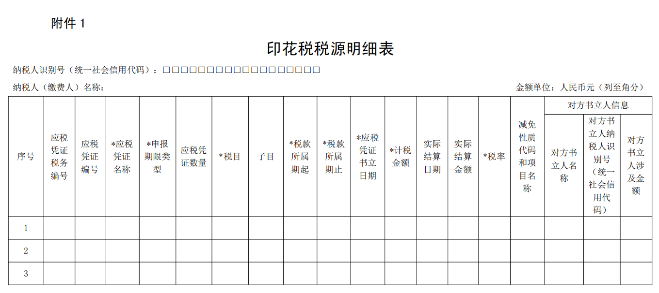 (一)纳税人应当根据书立印花税应税合同、产权转移书据和营业账簿情况,填写《印花税税源明细表》(附件1),进行财产行为税综合申报。