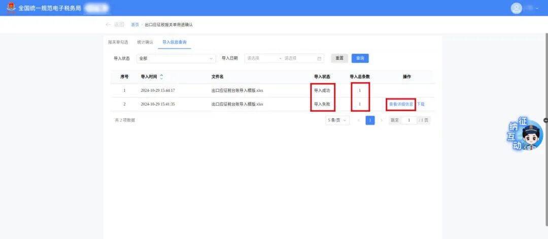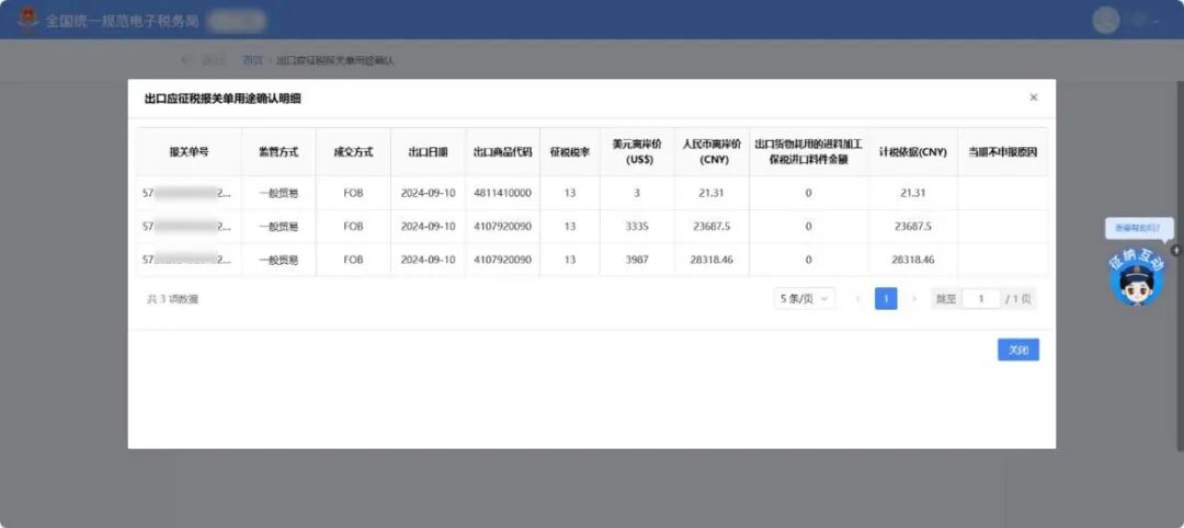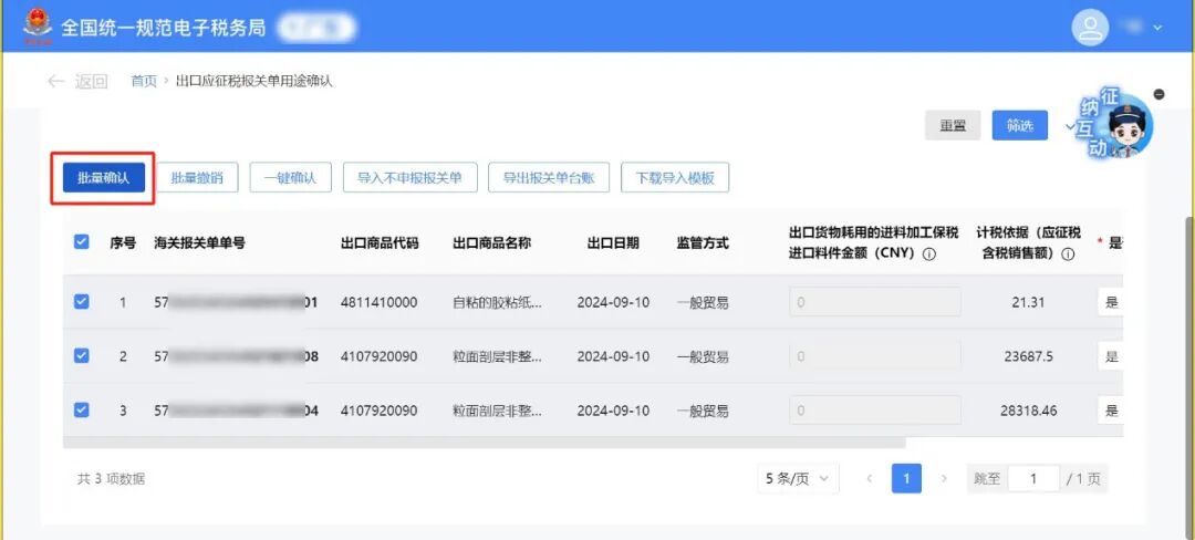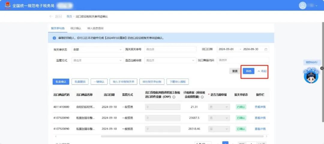 系统自动展示当前属期待确认用途的全部报关单,【报关单状态】默认选择“待确认”,出口日期默认为当前税款所属期,其中出口日期止固定为对应税款所属期的最末一日,出口日期起可以往前选择。 纳税人根据实际情况在【是否当期申报】列,确认报关单所列货物是否应在当期申报缴纳增值税。 确认选择【是】,将关联增值税销售收入,请企业根据自身实际情况结合增值税纳税义务发生时间选择;选择【否】时,请选择对应当期不申报原因。接下来对企业选择【是】与【否】的情形进行分别讲解。 如当期报关单均需申报缴纳增值税,可点击【一键确认】按钮进行一次性全部确认。 如当期部分报关单需申报缴纳增值税,可勾选对应的报关单并点击【批量确认】按钮进行确认。 对于监管方式为“进料XX”的报关单,可根据实际情况在【出口货物耗用的进料加工保税进口料件金额(CNY)】栏次填写对应金额后,进行确认(该栏次可填写负数)。 对于当期不需申报缴纳增值税的报关单,在【是否当期申报】列选择【否】,弹出不申报原因填列界面,根据实际情况选择后点击保存。 (1)选择“前期已申报”选项,需填写前期实际已申报的税款所属期。 (2)选择“当期已开具发票”选项,需填写对应发票信息(可模板导入)。报关单与发票之间允许“一对一”和“一对多”(即一张报关单对应多张发票),同一张发票不得重复使用。 (3)选择“出口代理”选项,系统会提示纳税人确认是否已开具代理出口货物证明,如纳税人未开具《代理出口货物证明》,可点击【去开具】按钮跳转【代理出口货物证明】模块;如纳税人已开具《代理出口货物证明》,可点击【关闭】按钮直接保存。 (4)选择“用于出口退税”、“适用出口免税”选项,可直接保存。 (5)选择“其他”选项,可根据实际情况录入不申报理由。不申报理由不少于20字。 确认后报关单状态由“待确认”变更为“已确认”,点击【查看详情】按钮可查看报关单确认详情。 (1)下载导入模板。纳税人可通过【下载导入模板】按钮下载模板,用于批量导入不申报报关单。 (2)导入不申报报关单。在模板中填写不申报原因等相关信息,其中涉及“当期已开具发票”的,需根据实际在模板中填写发票信息。完成填写后,点击【导入不申报报关单】按钮导入不申报的报关单。 (3)纳税人可通过【导入信息查询】模块查询导入结果,点击【查看详细信息】按钮可以查看导入失败原因。 (4)导出报关单台账。纳税人可筛选报关单,并点击【导出报关单台账】按钮导出信息。 如果报关单状态有误,可以点击【批量撤销】按钮进行报关单已确认状态的撤销,撤销后报关单状态变更为“待确认”。 纳税人完成报关单用途确认后,需点击【统计确认】按钮完成出口应征税报关单用途确认。首次点击【统计确认】按钮时,系统会自动生成《出口应征税报关单用途确认统计表》。 信息确认无误后,点击【确认统计】按钮,完成报关单用途确认。 纳税人完成确认统计后,如需更改报关单确认信息,需先点击【撤销统计】按钮撤销统计,回到【报关单勾选】页面,重新进行统计确认流程。已完成对应税款所属期增值税申报的情况下不可撤销统计。 若【报关单勾选】页面中的报关单状态信息发生变化,重新确认报关单用途后,需在【统计确认】页面点击【重新生成】按钮,更新《出口应征税报关单用途确认统计表》。 信息确认无误后,点击【确认统计】按钮,完成报关单用途确认。 1.出口应征税报关单确认处理操作是从几月份开始的?以前都没听说过! 答:2024年12月1日开始试点。根据国家税务总局2025年第2号公告相关规定,自2025年2月1日起施行。 答:无法进行增值税纳税申报,有可能会产生滞纳金和处罚金。 4.出口确认用途是不是征税的需要确认,退税的不用确认? 答:征税报关单需要确认,退税与免税不需要;与出口企业类型无关。 一、税务机关为纳税人提供适用增值税征税政策的出口货物信息数据归集服务。纳税人出口适用增值税征税政策的货物,在办理增值税纳税申报时,登录全国统一规范电子税务局,完成出口货物信息数据的用途确认。从事进料加工复出口业务的纳税人在出口货物信息数据用途确认时,需要填报对应出口货物耗用的进料加工保税进口料件金额。
