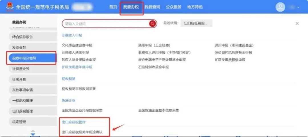【我要办税】-【税费申报及缴纳】-【出口应征税管理】-【出口应征税报关单用途确认】。 可通过首页搜索栏,输入关键字查找【出口应征税报关单用途确认】功能模块。 登录新电子税务局,点击【我要办税】-【税费申报及缴纳】-【出口应征税管理】-【出口应征税报关单用途确认】功能菜单,跳转至出口应征税报关单用途确认功能界面。 (二)用途确认操作