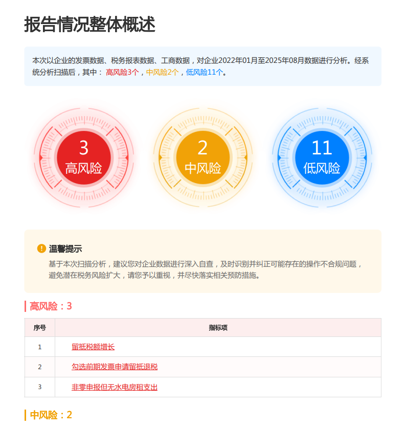 1.报告情况整体概述: 以企业的发票数据、税务报表数据、工商数据为基础,经系统扫描分析后,展示被检测企业的风险全貌,以及高、中、低风险类别各自对应的指标项目有哪些,便于用户对风险概况有大致了解。