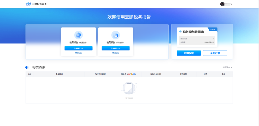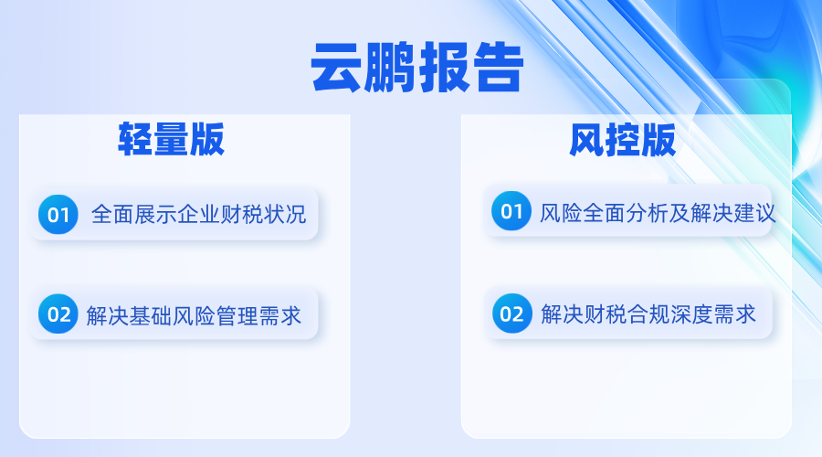 为了提高企业财税风险识别及管控水平,满足不同企业、不同业务场景的风险管理需求,云鹏报告重大更新升级,推出轻量版与风控版两款产品。