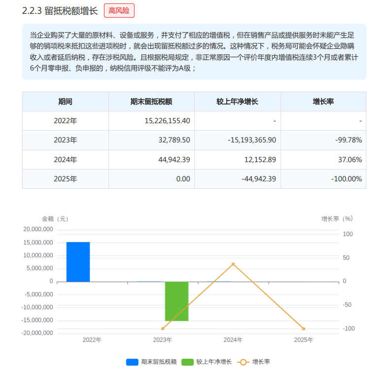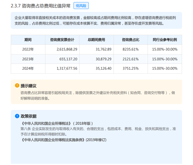 3.企业主体税种风险分析:包含企业实缴税费情况、增值税风险监控(比如留抵税额异常、税负异常)、企业所得税风险监控(比如水电费、咨询费、办公费异常)、税收优惠风险监控、综合税风险监控。